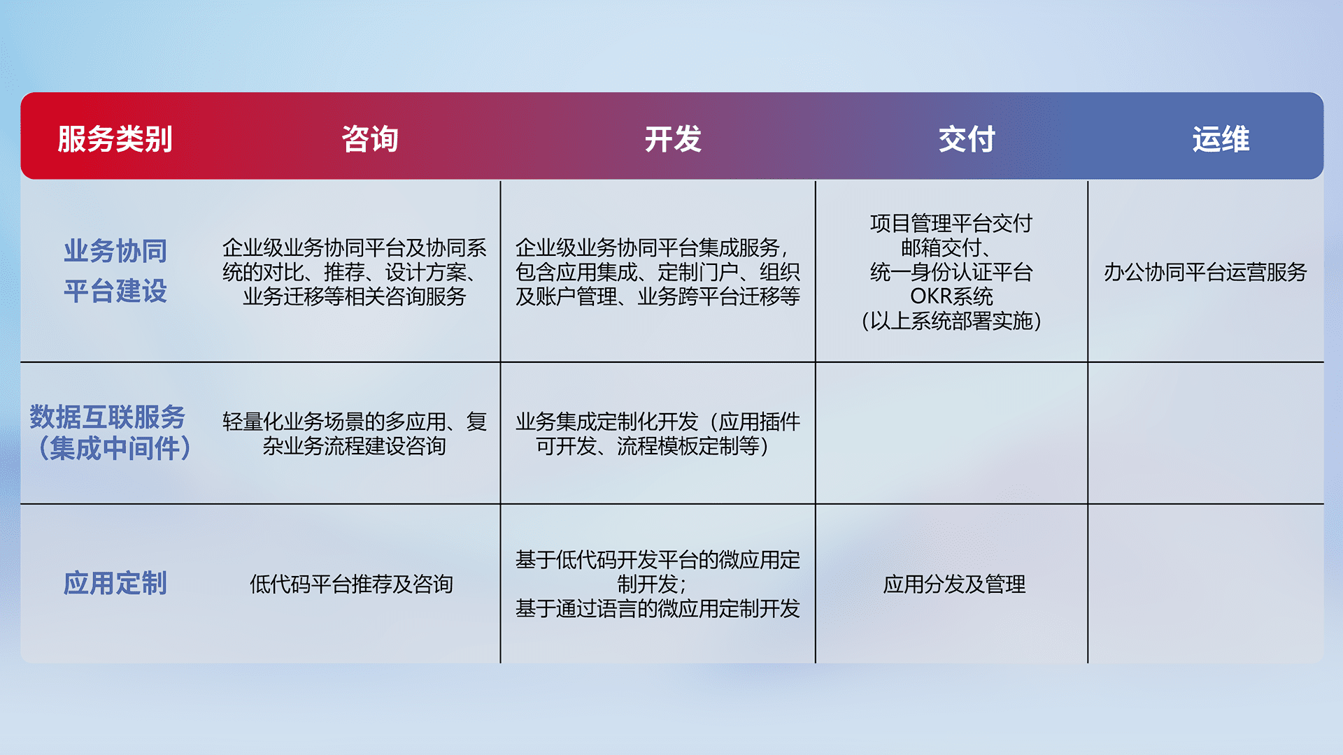 针对钉钉、、、企微、、IDaas等平台级产品提供产品的规划、、、、方案、、、交付、、定制化开发等服务,,,,实现如统一协同办公、、、、智能客户服务、、混合会议管理、、、、智能数据查询、、、等业务场景,,,,实现数字化转型。。。。